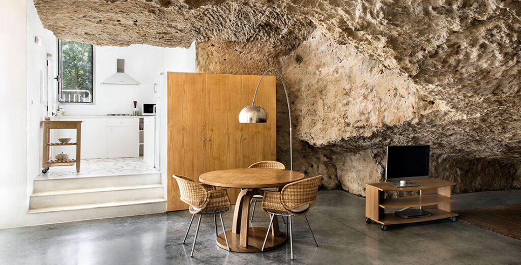In an area near Cördoba, Spain, rare formations of calcarenite rock emerge in slanting slabs from the earth, often forming natural caves and niches that were once used by farmers and herdsmen as temporary dwellings. One such cave was transformed into a modern rural house by the architects at UMMOestudio, who dared to contrast the natural surface.
